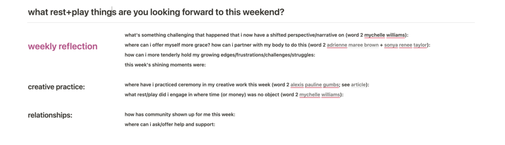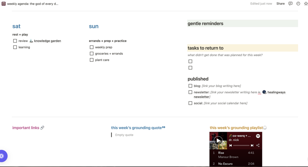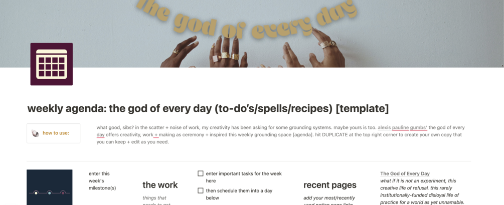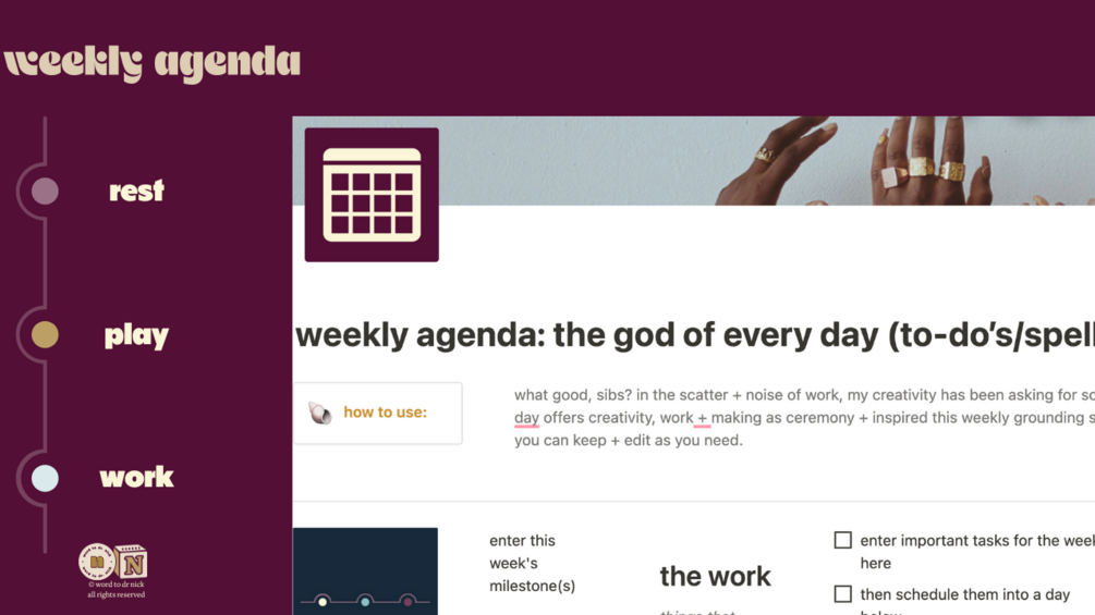 as a creative, artist + entrepreneur, it can be challenging to find groundedness in our day-to-day work. i built this notion space as a creative who feels most grounded when i can approach my day and work in practice. this notion space allows the creation of ceremony that guides the day’s work.